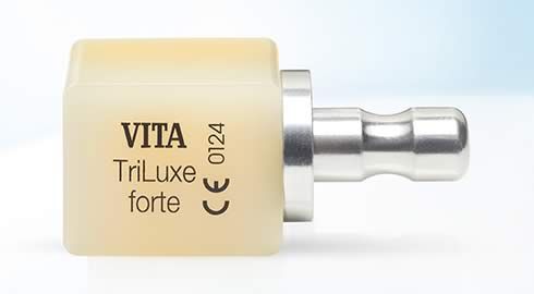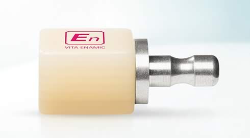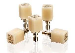 Bloc en céramique feldspathique couleur dent, polychromes, avec dégradé de couleur intégré pour reproduire le jeu de couleurs naturel.